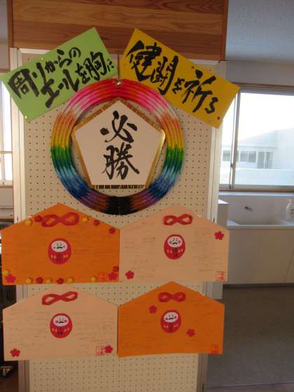 折り鶴で作ったグラデーションの千羽鶴、1年生の各クラスから贈られた絵馬の形のメッセージ、、、