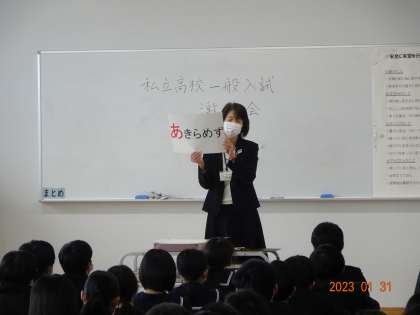 ほとんどの生徒にとっては初めての受検です。校長先生からは「緊張はつきもの。平常心で臨み、もっている自分の力を出し切ってきてほしい」とエールをいただきました。