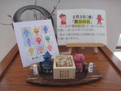 生徒玄関前で、2体の守り鬼が、災難がないよう、幸せが舞い込むよう守ってくれています。