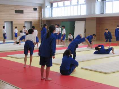 写真下は、保健体育の授業の様子です。マット運動の学習をしています。