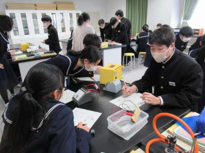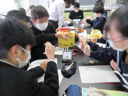 電圧と電流の関係について学習しています。実際に電流を流し、電圧計を使って試しています。