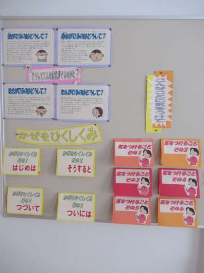 保健室前には、風邪をひかないようにするためのアドバイスが掲示してあります。ぜひ、一度、めくってみてください。予防もさることながら、風邪のメカニズムを知ることで、未然防止ができますよ。