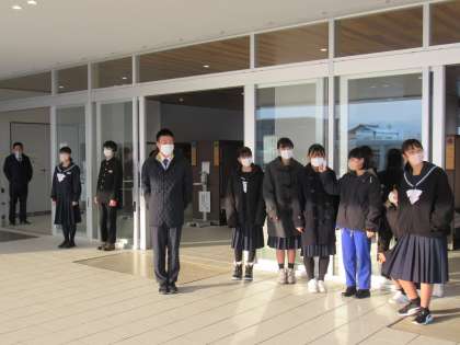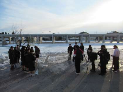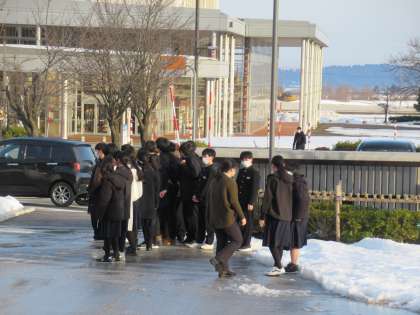 正門前には、2年2組が、生徒玄関前には1年3組が、除雪当番は1年4組、、、と大賑わいです。活気があります。