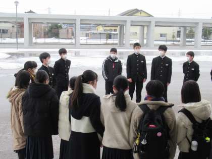 今朝の挨拶運動は、3年3組、2年2組と1年3組です。終わった後には、生徒会執行部と振り返りをしています。