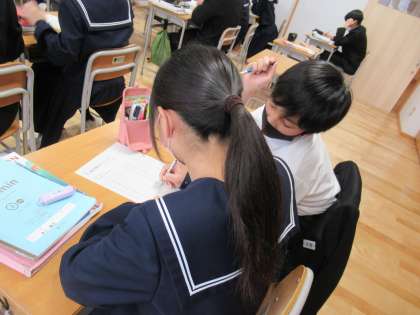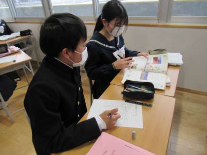 個人で振り返った後、ペアで確認しています。形が変わる動詞の過去形を覚えましょう。