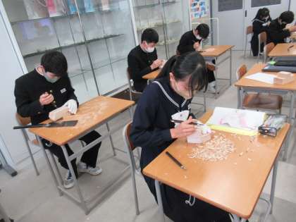2月14日(火) 2年生 美術 想像の生き物を彫ろう