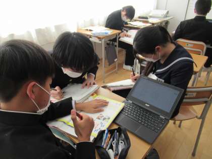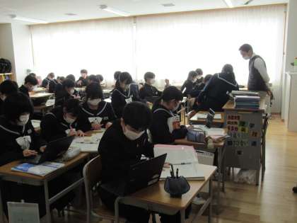テーマを決めて、chromebookのフォームでクラスにアンケートをとり、結果をまとめてプレゼンテーションを作成しています。