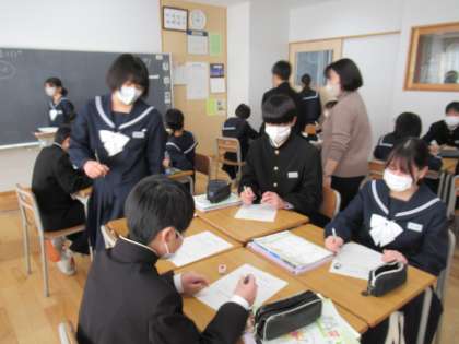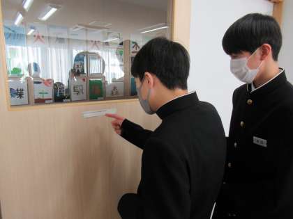 班で順番に1人ずつ、教室の色々な場所に貼ってあるヒントの文を読み取って班員に伝えます。
