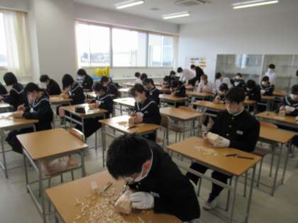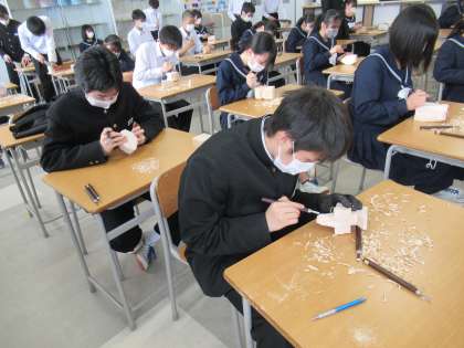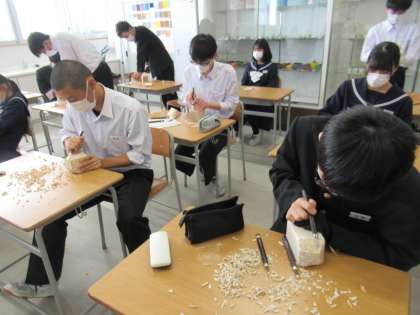 木を切ったり彫ったりしながら、想像の生き物を作っています。まだまだ先が長そうです。