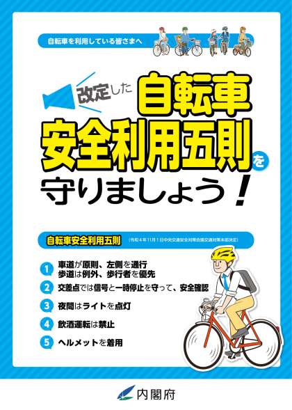特に、5のヘルメットの着用については、令和5年4月1日から、全ての年齢層の自転車利用者に対して、乗車用ヘルメットの着用の努力義務が課せられます。これは、学校の登下校だけではなく、プライベートでの自転車利用でも適用されます。
