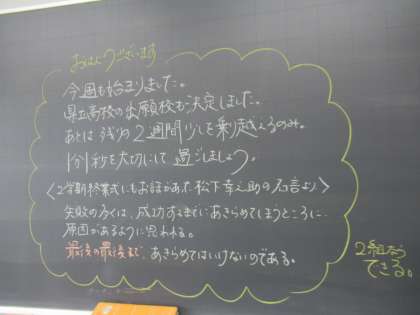 2月20日(月) 新しい週の始まり 公開日 2023/02/20 更新日 2023/02/20 八尾中学校のページ 学年末考査の週がスタートしました。 1年間の学習の総まとめの時期です。悔いのないよう、精一杯頑張りましょう。 3年生の皆さんは、最後の進路懇談会も終わり、県立高校一般入試出願もあります。 最後の定期考査に向けて、県立高校を受検する人は県立高校一般入試に向けて、全力で頑張りましょう。 何よりも健康安全!全力を発揮するためにも、健康安全に気を付けましょう。