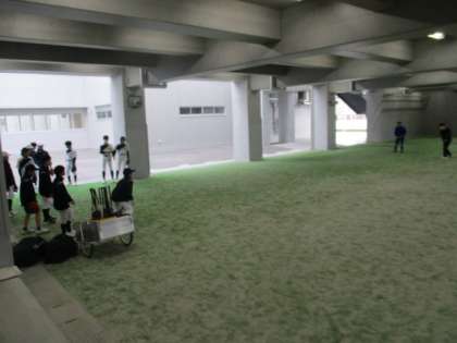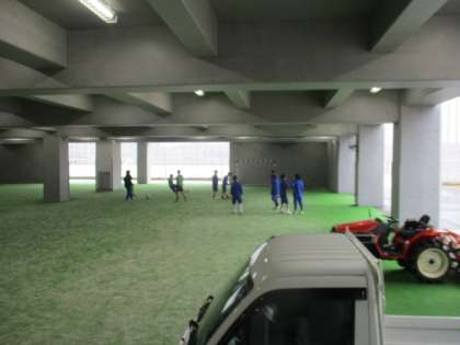 昨日までの晴れの天候とは異なり、雨が降っています。しかし、本校のピロティでは、野球部とサッカー部が元気よく活動しています。雨の日も安心!