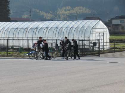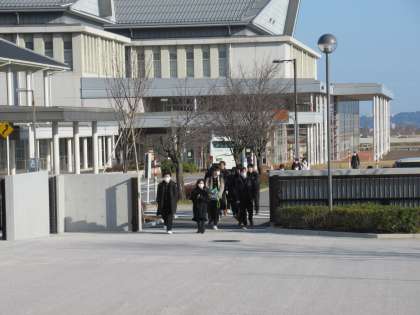 立候補者と推薦人が生徒玄関前で選挙活動をしています。