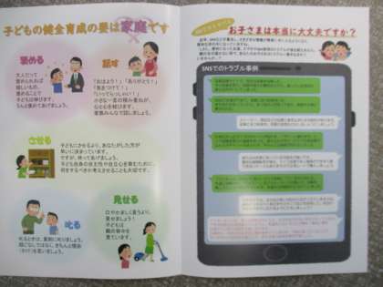 これは、中学校最終学年を控えて、様々な事柄に興味・関心をもつ時期になる生徒の健全育成・非行防止を目的としています。家庭を基盤とした子供の育成や、SNSトラブルに関する事例やトラブルの防止について記載してあります。また、悩み事相談窓口の連絡先も記載してあるので、子供達自身でも相談ができます。