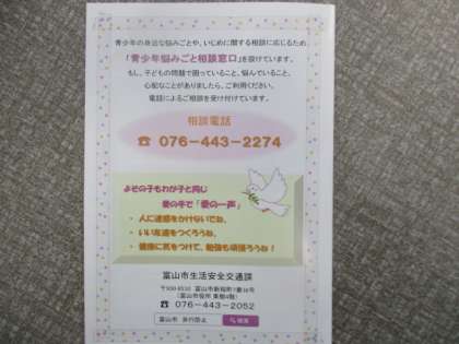 今週月曜日、3月6日に、富山市生活安全交通課が発行する、非行防止啓発用リーフレットを2年生の保護者を対象に配布しました。お手元に届いていますでしょうか。