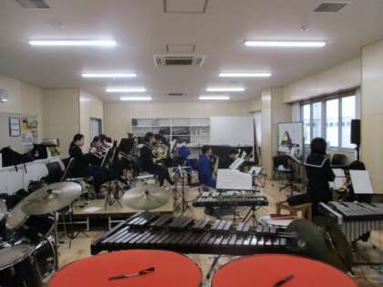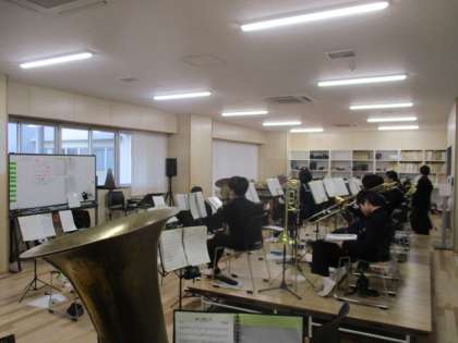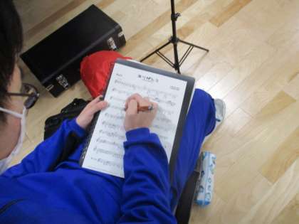 卒業式の入退場曲を練習しています。ポイントをメモしながら、よりよい演奏を目指して頑張っています。