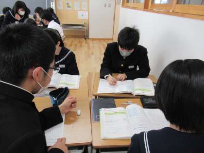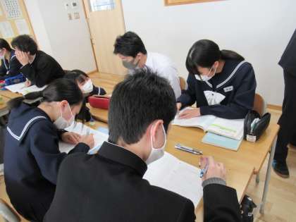 グループで話し合いながら、箱ひげ図を書いています。