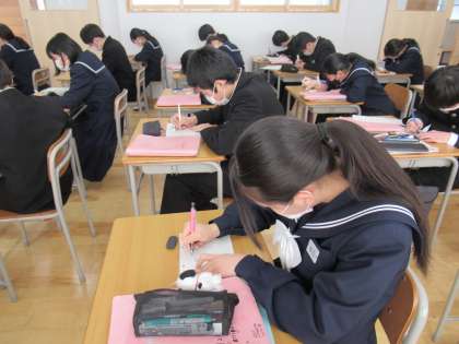 「この絵はあなたによって描かれたものですか」と絵を描いた人を捜し回る活動をしながら、受動態を学習しています。