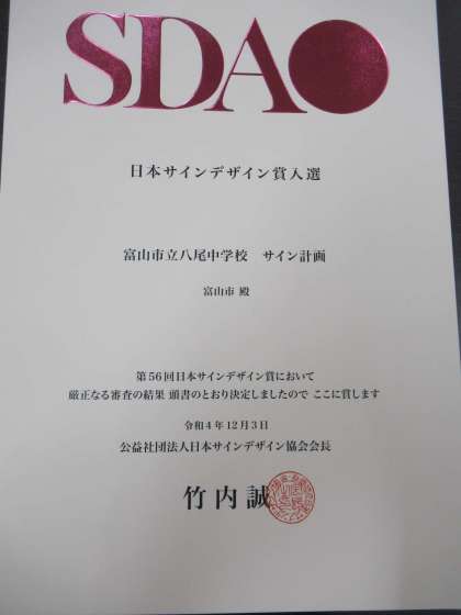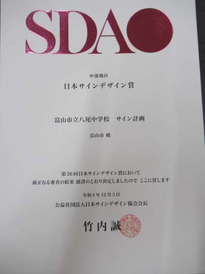 八尾中学校が、校舎のデザインが美しいことから、第56回日本サインデザイン賞を受賞しました。