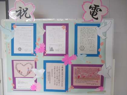 卒業式当日は、なかなか「祝電」を読む時間がないので、一足お先に学年フロアに掲示しました。