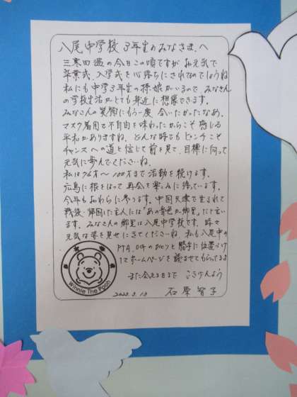 いても立ってもいられず、FAXをくださったその気持ちに応えることができるよう、素晴らしい態度で卒業式を迎えましょうね。