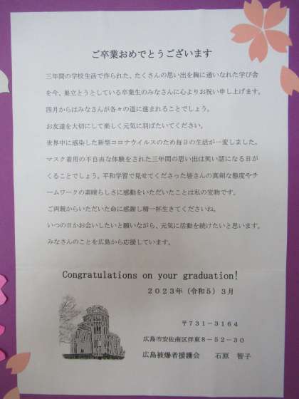 なんと!広島でお世話になった語り部さん、わざわざ3年生の皆さんに会うためだけに来校された語り部さんから、祝電の他に、本日FAXでメッセージが届きました。