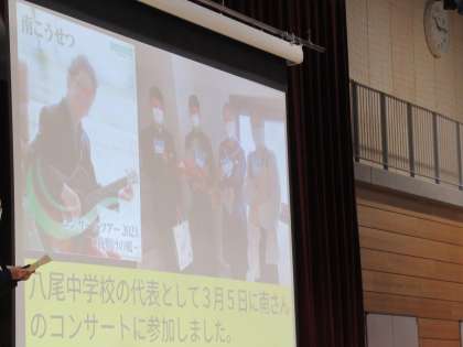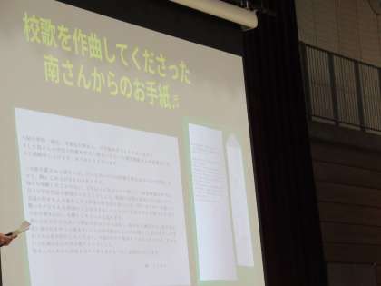 そのときの様子、南こうせつさんからいただいた手紙、メッセージ、エールを、代表生徒が全校に伝えました。