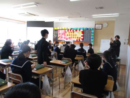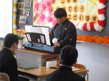3月15日(水) 第1回卒業証書授与式 最後の学活 その1 公開日 2023/03/15 更新日 2023/03/15 八尾中学校のページ 各教室で最後の時間を過ごしています。 この日のために練習した曲を演奏した担任もいました。写真は、1組の様子です。