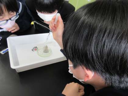 鑑定士のように、ルーペで真剣に観察しています。石灰岩に液体を垂らすと、、、泡が出ています。
