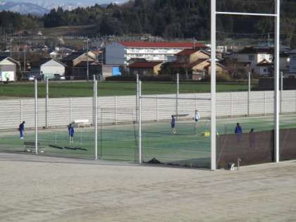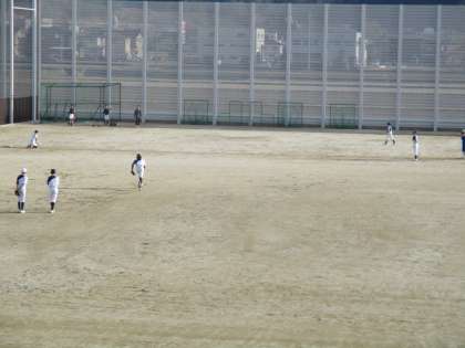 野球部は守備練習、ソフトテニス部は基礎打ちをしています。