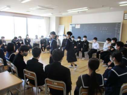 2年3組は、「フルーツバスケット」でお互いの好きなことや趣味等を聞き合っています。楽しそうに活動しています。