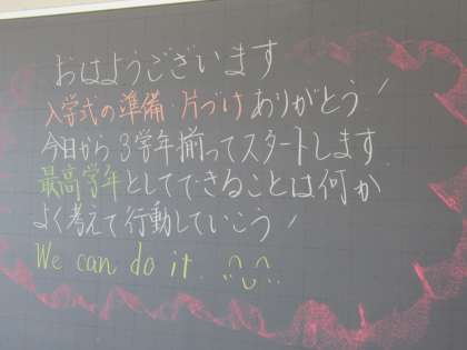 入学式の準備や片付けを「ありがとう」のメッセージからスタートです。「ありがとう」から始まる朝は素敵ですね。