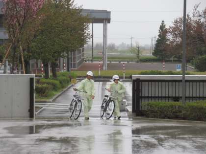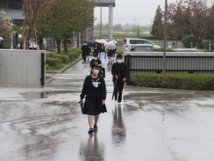 かっぱを着用して、自転車に乗っての通学は新入生には大変そうです。