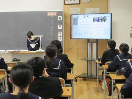 各班から1名ずつ代表を選出し、今度はクラスみんなの前で発表しています。