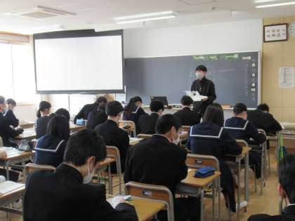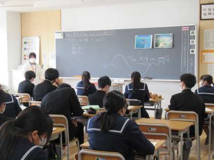 写真下は、英語の授業の様子です。オリエンテーション中です。