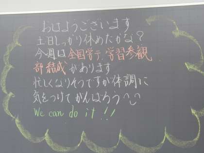 肌寒い朝です。新しい週が始まりました。今週は、土曜日が授業参観のため、いつもよりも長い週となります。