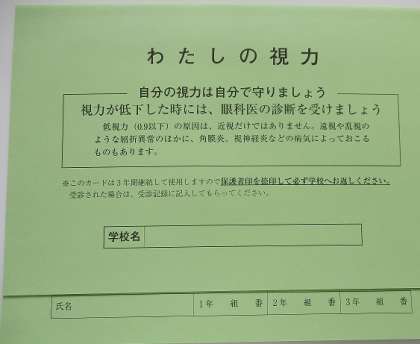 先日行った発育測定で、視力が低下した人、定期管理が必要な生徒に「わたしの視力カード」を渡しします。