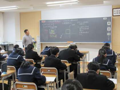 写真上は、技術の授業の様子です。キャビネット図の書き方について学習しています。