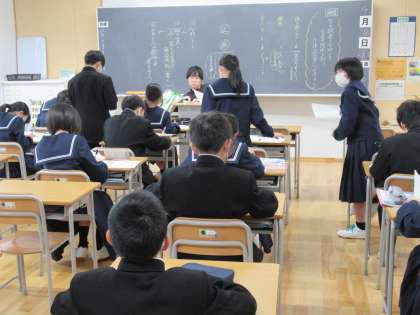 写真中は、国語の授業の様子です。先日実施した「富山市中1学力調査」の振り返りをしています。一人ずつ、分析したことを教科担当の先生に持って行きます。