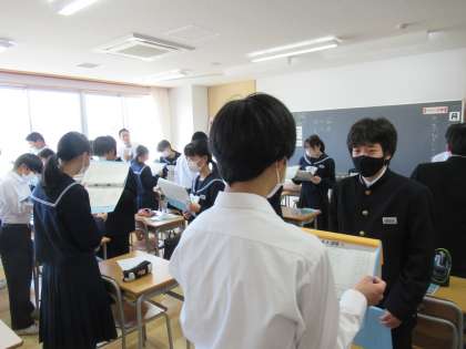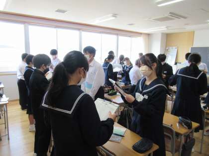 What time do you get up? I get up at seven.、、、のように互いのことを学習した表現で対話しながら伝え合っています。