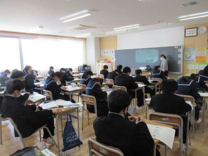 写真中は、理科の授業の様子です。実験のきまりについて学んでいます。