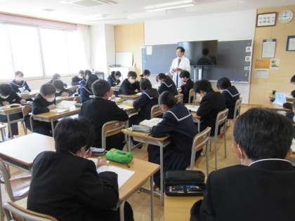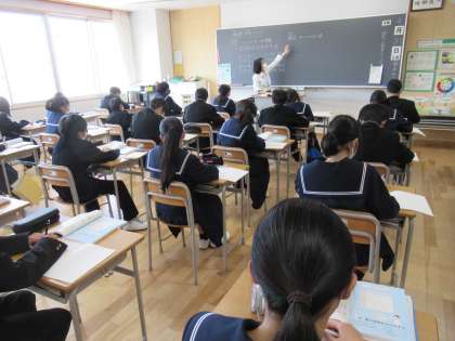 写真下は、数学の授業の様子です。「1は素数?」「0は?」の先生からの問いかけに、全員で答えています。