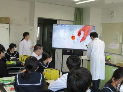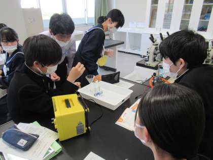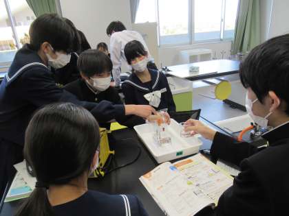 教科書に載っている実験器具と少し異なる実験器具のため、水がなかなか満タンにならず、悪銭苦闘しています。
