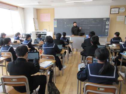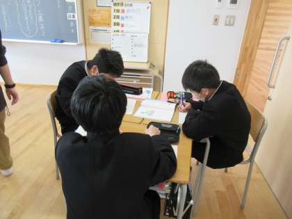 写真上は、技術の授業の様子です。情報活用の注意点等について学んでいます。