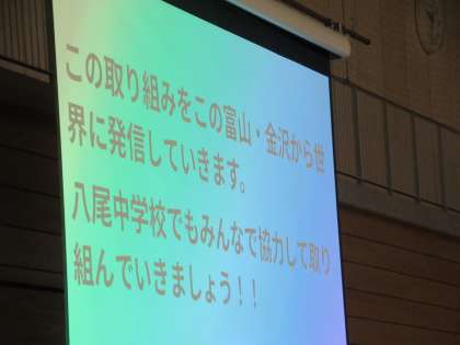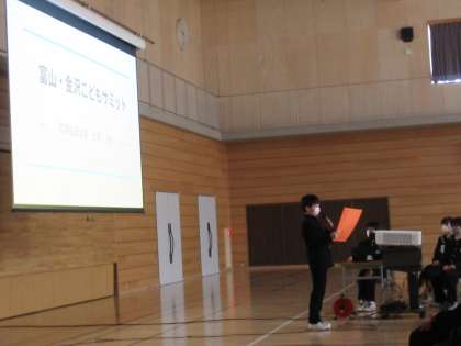 G7富山・金沢こどもサミットに本校を代表して参加した生徒会長から、改めて全校へ宣言書の紹介と呼びかけがありました。