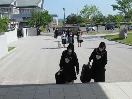 晴れの天候でよかったですね。家からキャリーケースを持って歩いてきた生徒もいます。