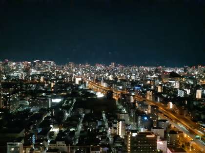 今日一日を振り返り、明日に生かします。窓の外には、大阪の夜景が広がっています。