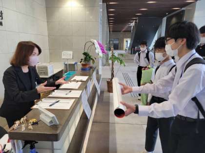 大阪工業大学を訪問する班は、到着するなり、観光大使としてポスターとシャクヤクの花を渡して八尾町をPRしました。