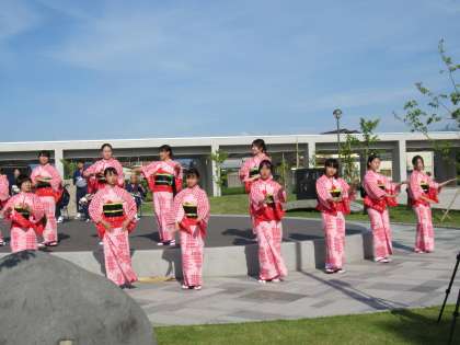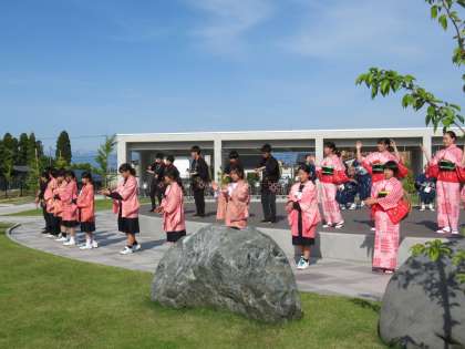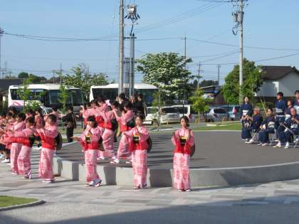 「八尾のニワ」で郷土芸能部の踊りと地域の方の演奏と歌でお見送りしました。