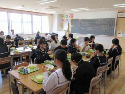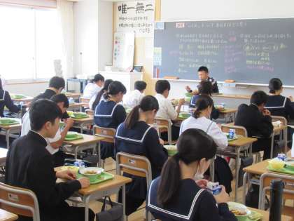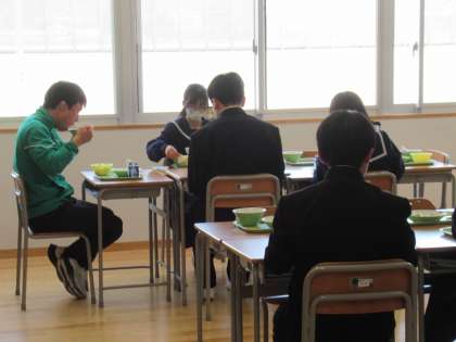 4人グループで食べているクラスもあれば、列ごとに向かい合っているクラスもあれば、前を向いて食べているクラスもあります。